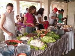O Serviço de Buffet de churrasco é o mais requisitado pelos clientes. Neste serviço disponibilizamos vários tipos de carnes em peças (alcatra, maminha, fraldinha, contra filé, frango e linguiça suína), refrigerantes a vontade, arroz, farofa, vinagrete, patês com pães fatiados, três tipos de antepastos (batatinha a vinagrete, berinjela temperada e tabule), três tipos de saladas, e para sobremesa, três tipos de frutas geladas e descascadas ou sorvete. Neste serviço já estão inclusos todos os materiais, utensílios e mão-de-obra necessários (churrasqueiro, cozinheira, garçons, toalhas de mesa, talheres de inox, pratos de louça branca, etc).